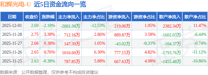 证券之星消息,截至2025年12月1日收盘,和辉光电(688538)报收于2.69元,下跌2.18%,换手率1.34%,成交量76.84万手,成交额2.08亿元。