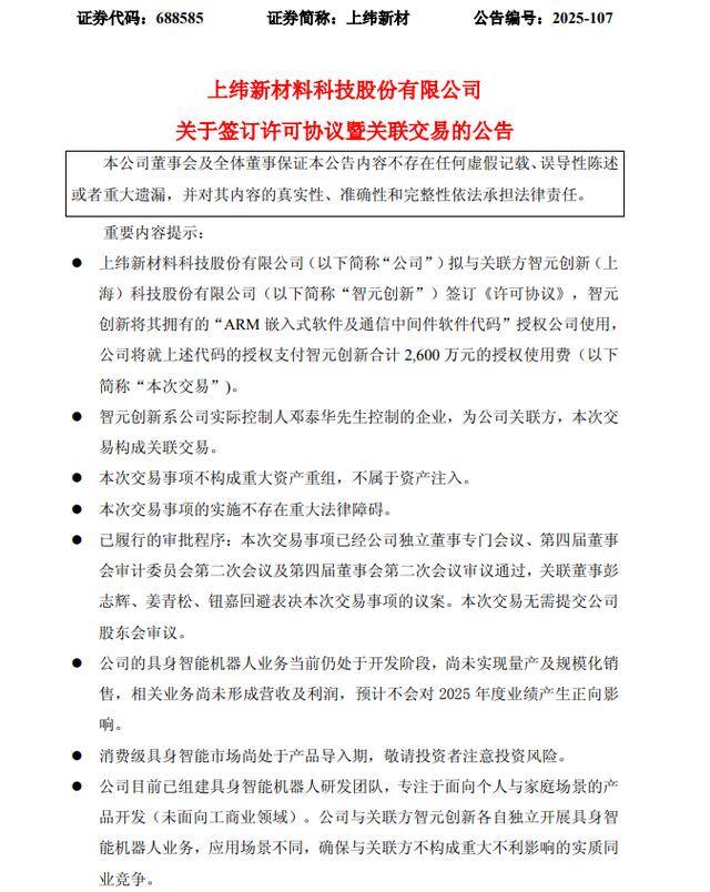 12月5日,上纬新材(688585.SH)公告称,公司拟与关联方智元创新签订《许可协议》,智元创新将其拥有的“ARM嵌入式软件及通信中间件软件代码”授权公司使用,公司将支付智元创新合计2600万元的授权使用费。该交易构成关联交易,但不构成重大资产重组。公司具身智能机器人业务当前处于开发阶段,尚未实现量产及规模化销售,预计不会对2025年度业绩产生正向影响。