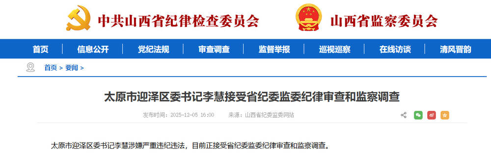 12月5日,山西省纪委监委网站消息,太原市迎泽区委书记李慧接受省纪委监委纪律审查和监察调查。