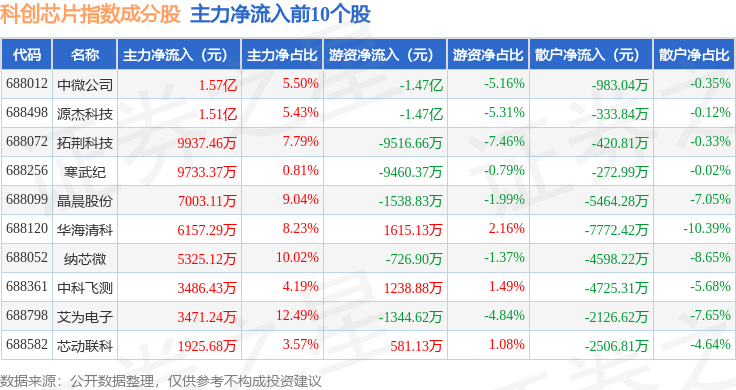 资金流向方面,科创芯片(000685)指数成份股当日主力资金净流出合计8.53亿元,游资资金净流入合计3.52亿元,散户资金净流入合计5.02亿元。成份股资金流向详情见下表: