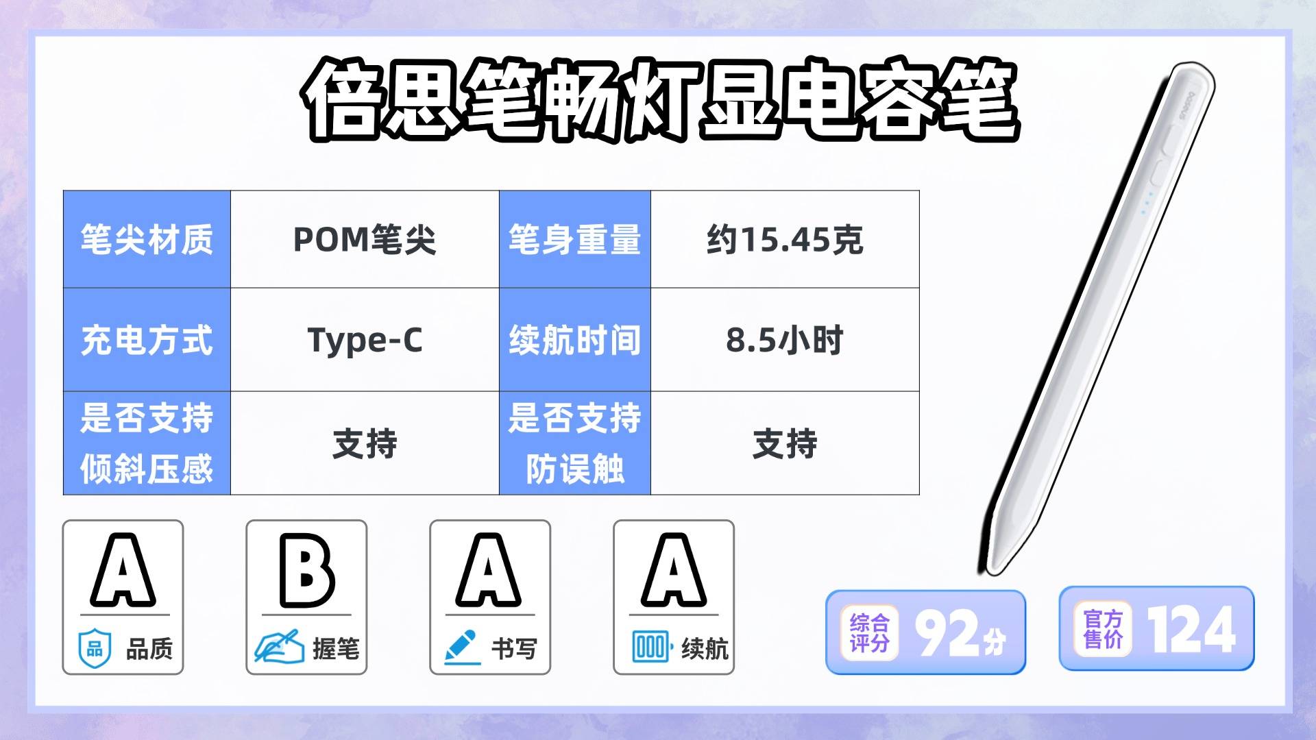 这款电容笔的整体质感很好,使用一体式设计,笔尖和笔身浑然一体,并不突兀。就是笔身稍重一些,单支笔的重量就有15.45克,长时间握持的话容易使手腕酸痛。但好在它使用了清爽涂层,短时间握笔的体验感还是不错的,也不容易黏腻。而且它点击笔身上的按钮就可以开机,笔尖还使用了POM材质,优化了阻尼感,也有防误触功能,不用悬肘操作。另外它还设置了三颗Led电量指示灯可以帮助我们判断电量情况,也支持Type-C有线补电,还算比较方便。同时续航也有个8.5小时,足以满足我们的基础使用需求。