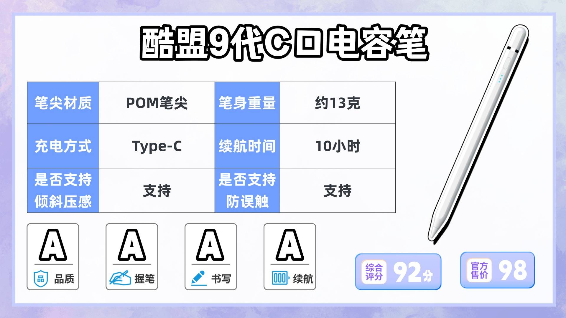 这款电容笔采用了航空铝合金材质,表面触感细腻,而且其笔身粗细适中,重量仅约13.7g,整体的握持感轻盈,长时间使用也不会有明显负担。同时它的笔尖为可更换的POM材质,耐磨性较好,书写小字时依然保持精准。并且它还支持倾斜压感,线条粗细可随角度变化,适合日常书写与轻度绘画。另外充电方面,它采用Type-C接口,续航约9小时,还算不错。只是它充满电大约需要90分钟,这个充电速度略慢。因此建议每次使用完毕,及时检查电量并及时充电,以便耽误下次的使用!