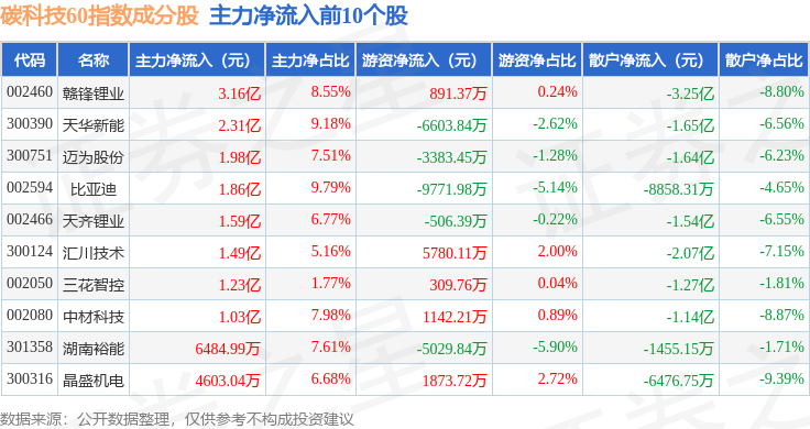 资金流向方面,碳科技60(399060)指数成份股当日主力资金净流出合计26.91亿元,游资资金净流入合计4.49亿元,散户资金净流入合计22.42亿元。成份股资金流向详情见下表: