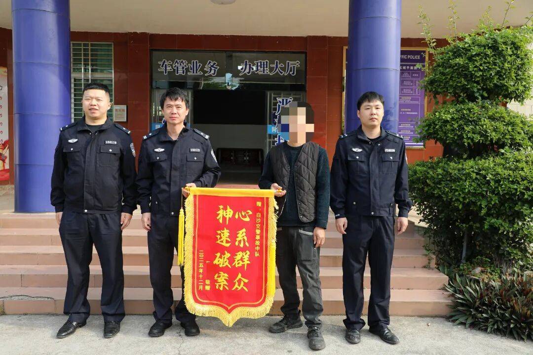 12月8日上午,群众将一面印有“心系群众 神速破案”的锦旗送到海南省白沙黎族自治县公安局交通事故处理民警手中,对民警锲而不舍、快速侦破交通肇事逃逸案件表示感谢。