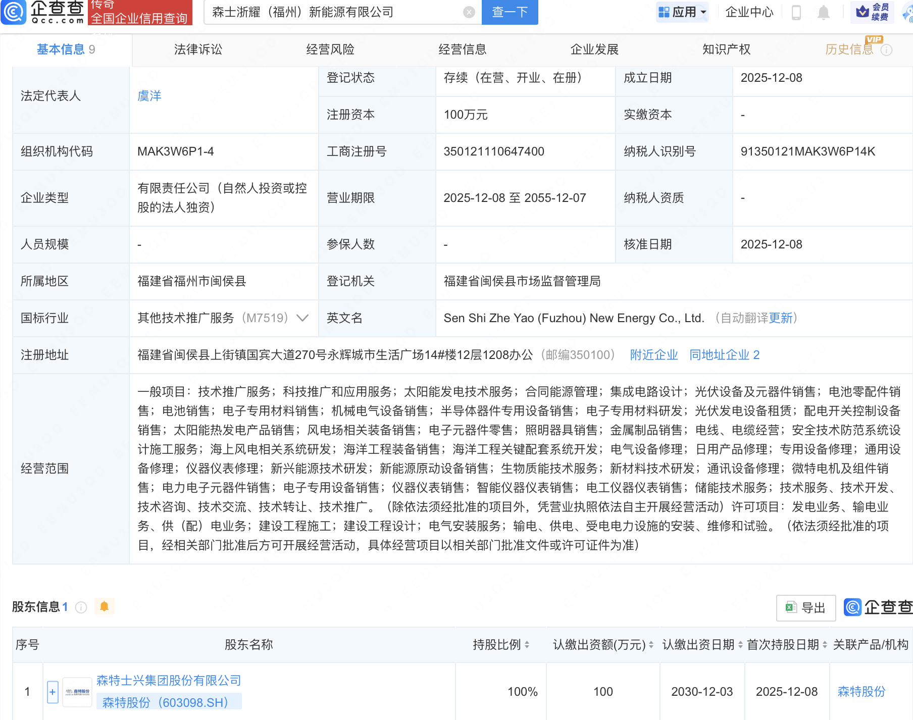 企查查APP显示,近日,森士浙耀(福州)新能源有限公司成立,经营范围包含:集成电路设计;半导体器件专用设备销售;电子专用材料研发;光伏发电设备租赁等。企查查股权穿透显示,该公司由森特股份(603098)全资持股。