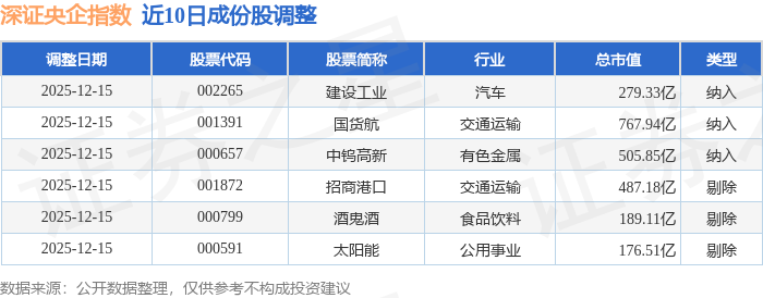 近10日内深证央企(399335)指数成份股做了调整,新纳入了3只股票,剔除了3只股票。