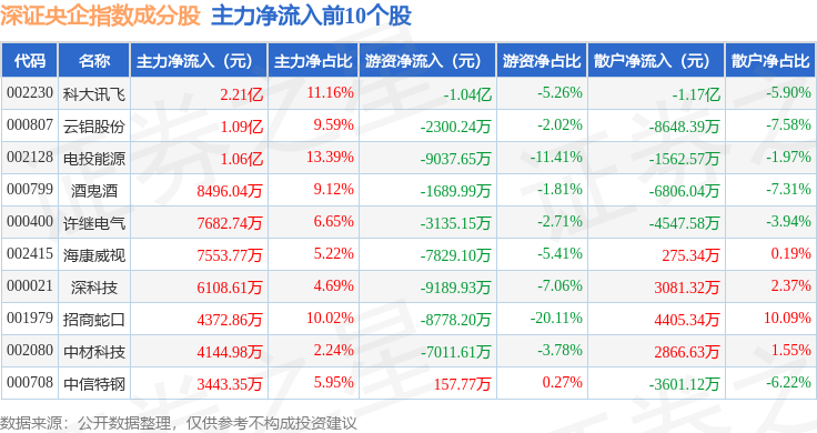 资金流向方面,深证央企(399335)指数成份股当日主力资金净流入合计2.0亿元,游资资金净流出合计10.27亿元,散户资金净流入合计8.27亿元。成份股资金流向详情见下表:
