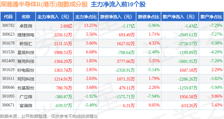 资金流向方面,深港通半导体R(港币)(483068)指数成份股当日主力资金净流出合计19.34亿元,游资资金净流入合计3.11亿元,散户资金净流入合计16.23亿元。成份股资金流向详情见下表: