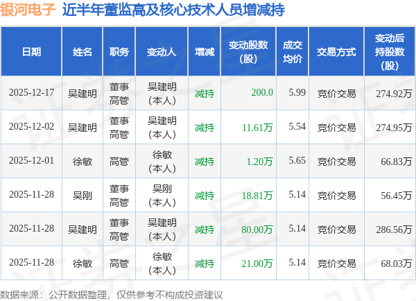 银河电子近半年内的董监高及核心技术人员增减持详情如下: