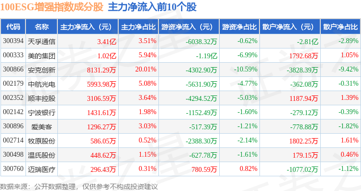 资金流向方面,100ESG增强(970033)指数成份股当日主力资金净流出合计65.06亿元,游资资金净流入合计23.77亿元,散户资金净流入合计41.29亿元。成份股资金流向详情见下表: