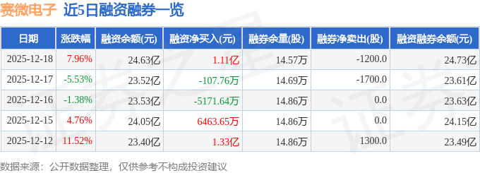 赛微电子融资融券信息显示,融资方面,当日融资买入8.82亿元,融资偿还7.71亿元,融资净买入1.11亿元。融券方面,融券卖出0.0股,融券偿还1200.0股,融券余量14.57万股,融券余额956.96万元。融资融券余额24.73亿元。