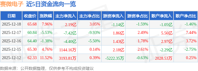 12月18日的资金流向数据方面,主力资金净流入2.19亿元,占总成交额3.05%,游资资金净流出1.14亿元,占总成交额1.59%,散户资金净流出1.05亿元,占总成交额1.46%。