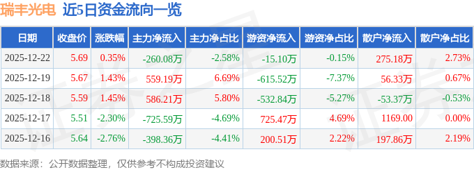 证券之星消息,截至2025年12月22日收盘,瑞丰光电(300241)报收于5.69元,上涨0.35%,换手率3.0%,成交量17.6万手,成交额1.01亿元。