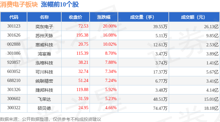 证券之星消息,12月23日消费电子板块较上一交易日上涨1.27%,奕东电子领涨。当日上证指数报收于3919.98,上涨0.07%。深证成指报收于13368.99,上涨0.27%。消费电子板块个股涨跌见下表: