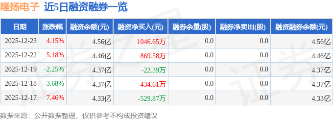 隆扬电子融资融券信息显示,融资方面,当日融资买入8013.56万元,融资偿还6966.91万元,融资净买入1046.65万元。融券方面,融券卖出0.0股,融券偿还0.0股,融券余量0.0股,融券余额0.0万元。融资融券余额4.56亿元。