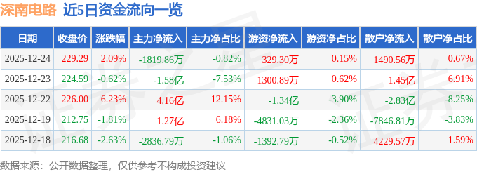 证券之星消息,截至2025年12月24日收盘,深南电路(002916)报收于229.29元,上涨2.09%,换手率1.49%,成交量9.89万手,成交额22.32亿元。