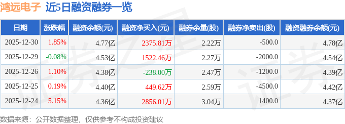 鸿远电子融资融券信息显示,融资方面,当日融资买入8678.62万元,融资偿还6302.8万元,融资净买入2375.81万元。融券方面,融券卖出1400.0股,融券偿还1900.0股,融券余量2.22万股,融券余额118.28万元。融资融券余额4.78亿元。