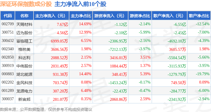 资金流向方面,深证环保(399638)指数成份股当日主力资金净流出合计39.51亿元,游资资金净流入合计9.32亿元,散户资金净流入合计30.19亿元。成份股资金流向详情见下表: