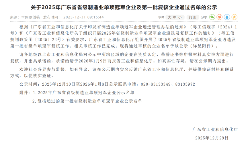 近日,广东省工业和信息化厅公布了2025年广东省省级制造业单项冠军企业及第一批复核企业通过名单,希荻微电子集团股份有限公司(以下简称“希荻微”或“公司”)凭借在电源管理芯片领域的技术突破与市场领导力成功入选,成为模拟芯片领域标杆企业。