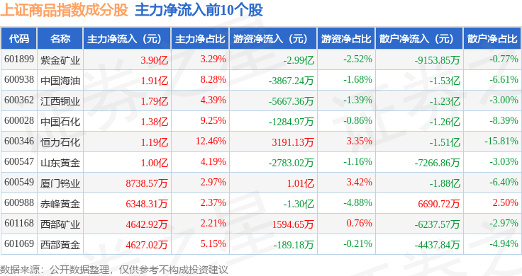 上证商品(000066)指数十大成份股详情如下: