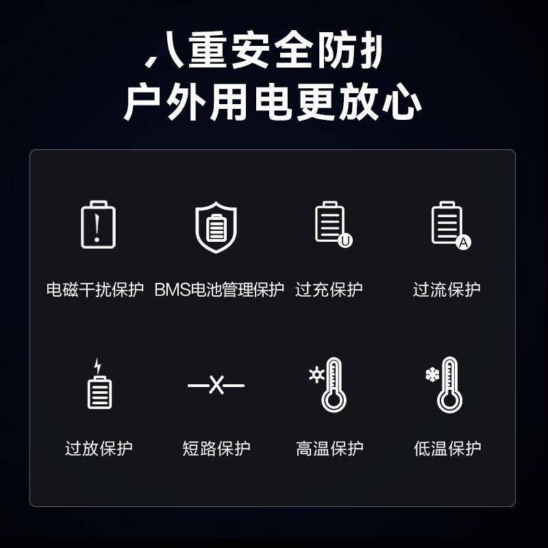 采用军用级磷酸铁锂电池,相比普通锂电池更耐高温、寿命更长。内置过充、过放、短路、过温等12重保护机制,还有BMS智能管理系统实时监控电池状态,使用更安心。