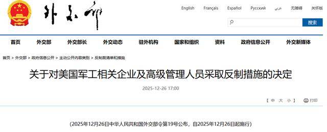 针对此次美对台军售计划,中方于2025年12月26日宣布对20家美国军工相关企业及10名高级管理人员采取反制措施,冻结在中国境内的动产、不动产和其他各类财产,禁止中国境内的组织、个人与其进行有关交易、合作等活动,以及不予签发签证、不准入境(包括香港、澳门)等。