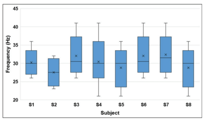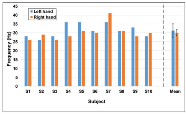图2. 各受试者左右手的个体特异性电刺激频率。S1代表截肢者,其余编号代表健全受试者。