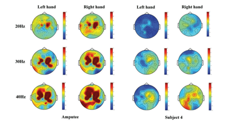 图5. 受试者1(截肢者)与受试者4的典型ERSP空间分布对比图。