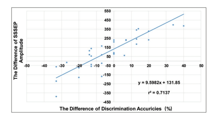 图4. 左右手刺激下SSSEP振幅差与心理物理测试辨别正确率差之间的线性相关性图示。