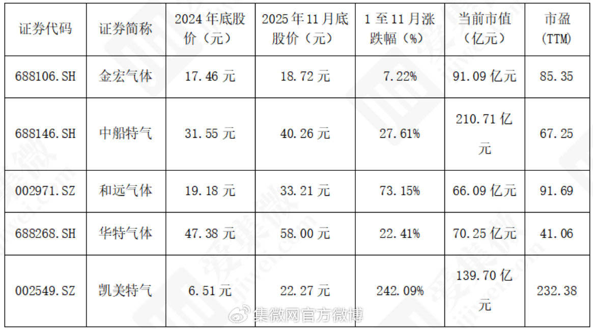 2025 年 1-11 月,五家公司股价均上涨,凯美特气涨幅 242.09% 断层领先,和远气体(73.15%)、中船特气(27.61%)紧随其后,金宏气体(7.22%)与华特气体(22.41%)涨幅温和。股价上涨核心逻辑包括业绩修复(金宏气体、华特气体)、业务布局落地(和远气体)、行业复苏与技术优势(中船特气)及赛道红利(凯美特气)。