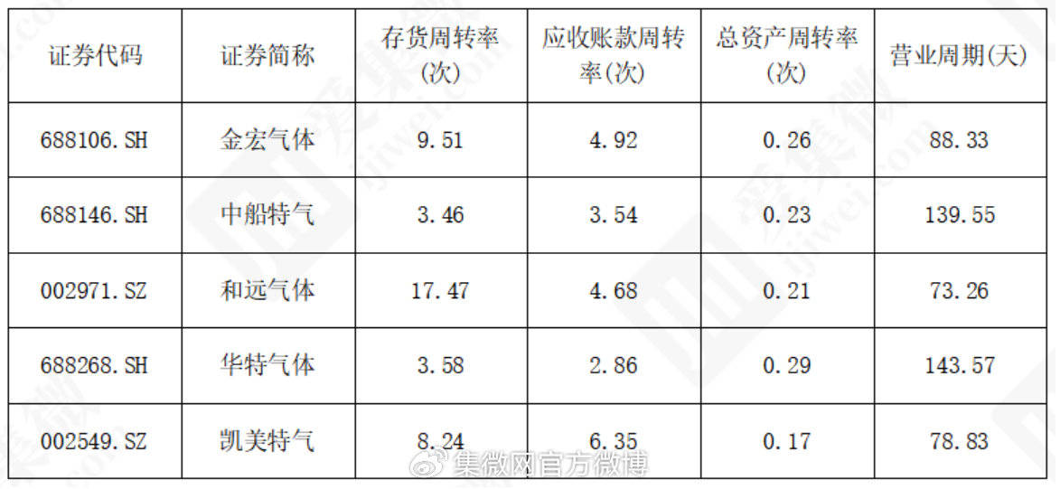 和远气体存货周转率 17.47 次大幅领跑,中船特气与华特气体不足 3.6 次;凯美特气应收账款周转率 6.35 次回款最优,华特气体 2.86 次资金回笼承压;总资产周转率中华特气体 0.29 次效率最高,凯美特气 0.17 次垫底;营业周期上,和远气体 73.26 天最顺畅,华特气体与中船特气均超 139 天,资金占用时间较长。