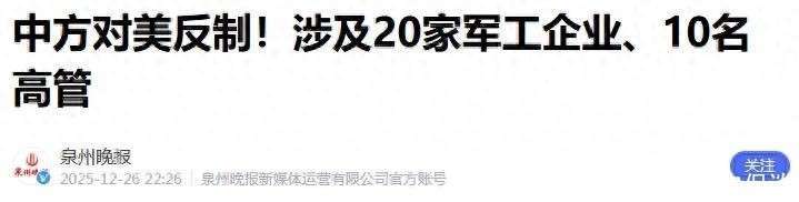 12月26日,中国外交部发布了一份震撼的反制清单,标志着新一轮国际博弈的开始。这份清单影响深远,不仅冻结了20家美国军工企业在华的资产,还将10名高层管理人员列入全球入境禁令名单,精准打击美国的关键利益。