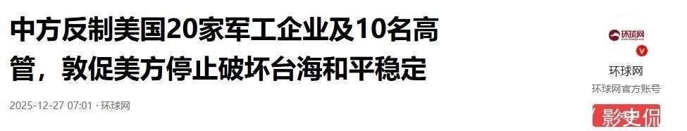 与此同时,中国的反制措施更为直接,打击美国军工产业的核心。12月26日,中国外交部宣布冻结诺斯罗普·格鲁曼、波音圣路易斯等20家美国军工巨头在华的资产,相关高管被列入入境禁令名单,任何中国组织或个人都不得与这些公司进行业务往来。