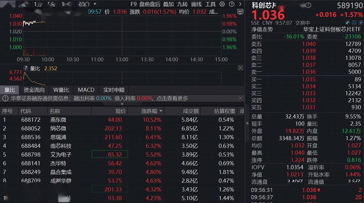 1月28日,科创芯片继续走强,“全芯”的科创芯片ETF华宝(589190)上市第2日,继昨日场内价格大涨2.72%,今日续涨逾1.5%。成份股多数走强,燕东微领涨逾10%,模拟芯片方向强势,纳芯微、思瑞浦、南芯科技、艾为电子等涨幅居前。