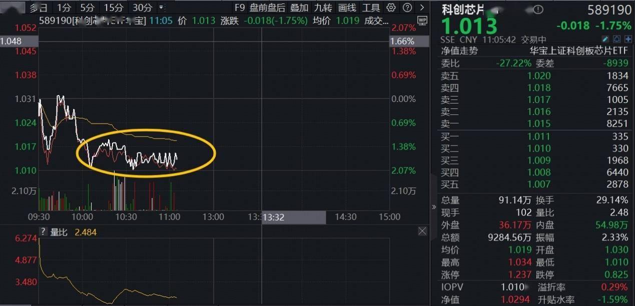 1月29日,芯片赛道短线回调,全“芯”科创芯片ETF华宝(589190)早盘低开后冲高回落,场内价格现跌1.75%,水下区间持续宽幅溢价,显示买盘资金逢跌积极介入。