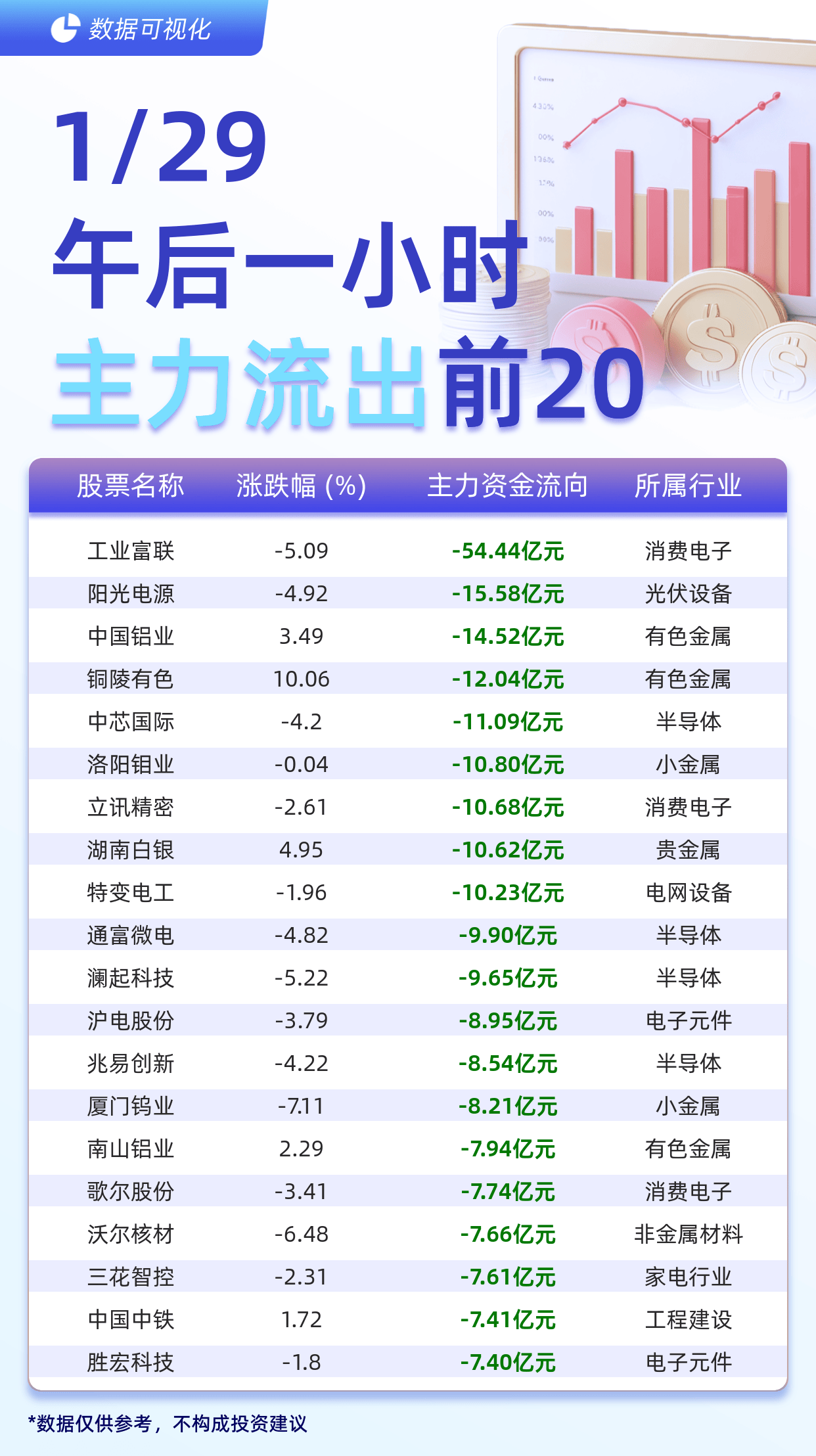 据交易所数据显示,截至1月29日午后一小时,主力资金流出前20的股票分别为: 工业富联(-54.44亿元)、 阳光电源(-15.58亿元)、 中国铝业(-14.52亿元)、铜陵有色(-12.04亿元)、 中芯国际(-11.09亿元)、 洛阳钼业(-10.80亿元)、 立讯精密(-10.68亿元)、 湖南白银(-10.62亿元)、 特变电工(-10.23亿元)、 通富微电(-9.90亿元)、 澜起科技(-9.65亿元)、 沪电股份(-8.95亿元)、 兆易创新(-8.54亿元)、 厦门钨业(-8.21亿元)、 南山铝业(-7.94亿元)、 歌尔股份(-7.74亿元)、 沃尔核材(-7.66亿元)、 三花智控(-7.61亿元)、 中国中铁(-7.41亿元)、 胜宏科技(-7.40亿元)。
