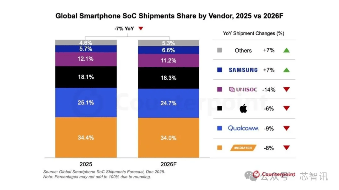 Counterpoint Research也预计,2026年全球智能手机SoC出货量预计将同比下滑7%,其中150美元以下的低端机型受冲击最重。
