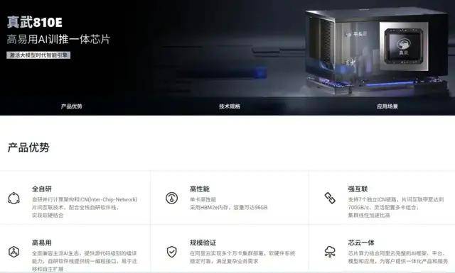 据官网介绍,平头哥真武810E采用自研并行计算架构和ICN(Inter-Chip-Network)片间互联技术,配合全栈自研软件栈,实现软硬件全自研。采用HBM2e内存,容量可达 96GB,支持7个独立ICN链路,每颗真武810E芯片配备7个ICN片间互联端口,配合平头哥自研互联加速库,实现多卡协同工作,从而高效支持大模型训练及推理需求,片间互联带宽达到700GB/s,灵活配置多卡组合。可应用于AI训练、AI推理和自动驾驶等场景。