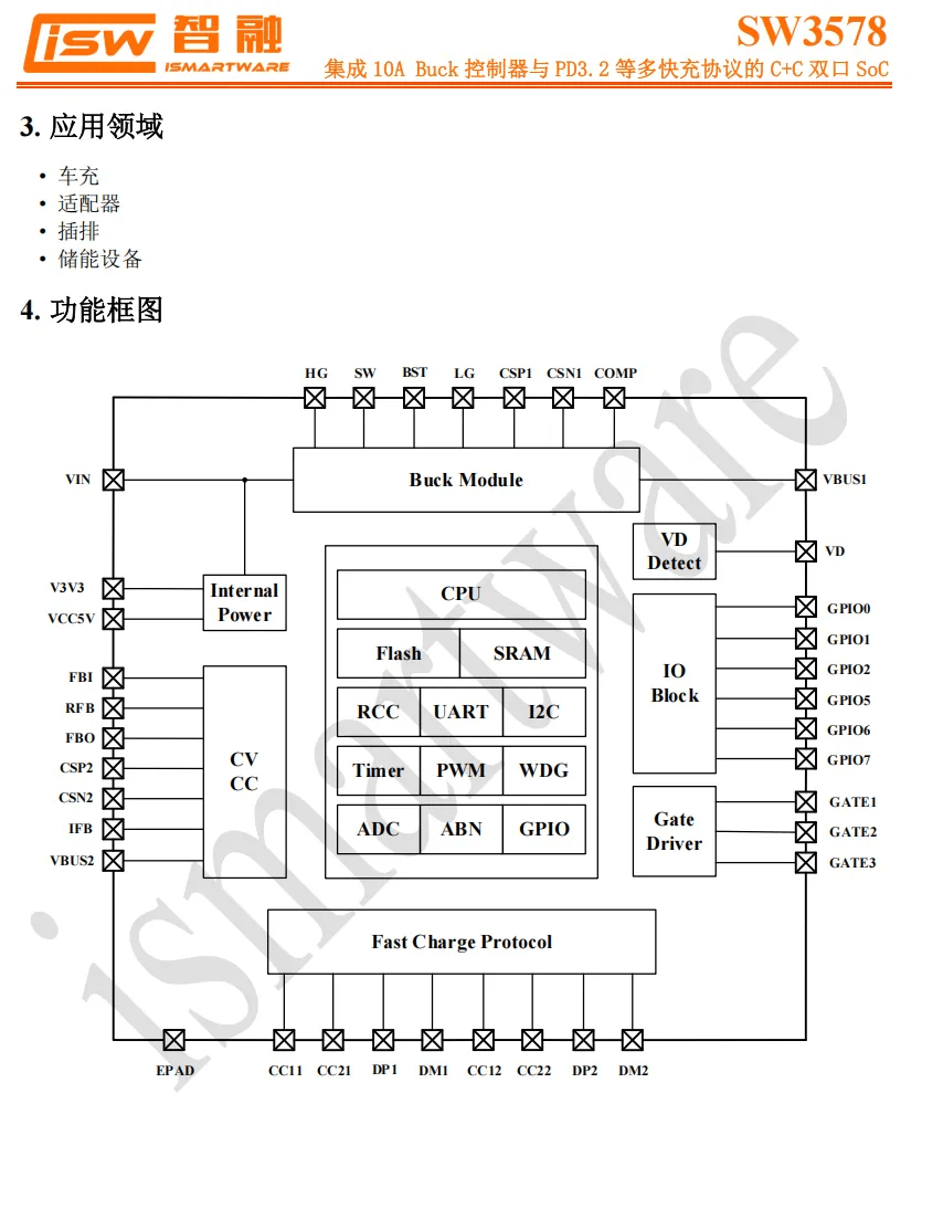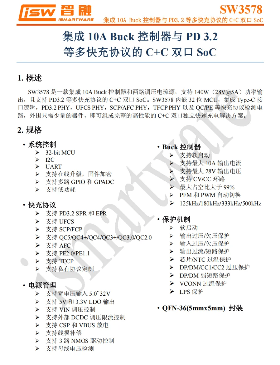 SW3578 内部集成32bit MCU 并集成双路独立的Type-C 逻辑,支持 PD3.2 SPR AVS、PD3.2 EPR AVS、UFCS、SCP/FCP、QC5/4+/4/3+/3.0/2.0、AFC、PE2.0/1.1、TFCP 等多种快充协议,并支持私有协议定制。