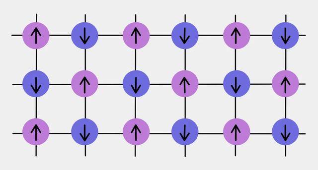 当被冷却到较低温度时,电子会以一种有序、交替的图样排列起来。由于相反方向的向上/向下自旋彼此抵消,材料整体上不表现出净磁化(总体磁性为零)。