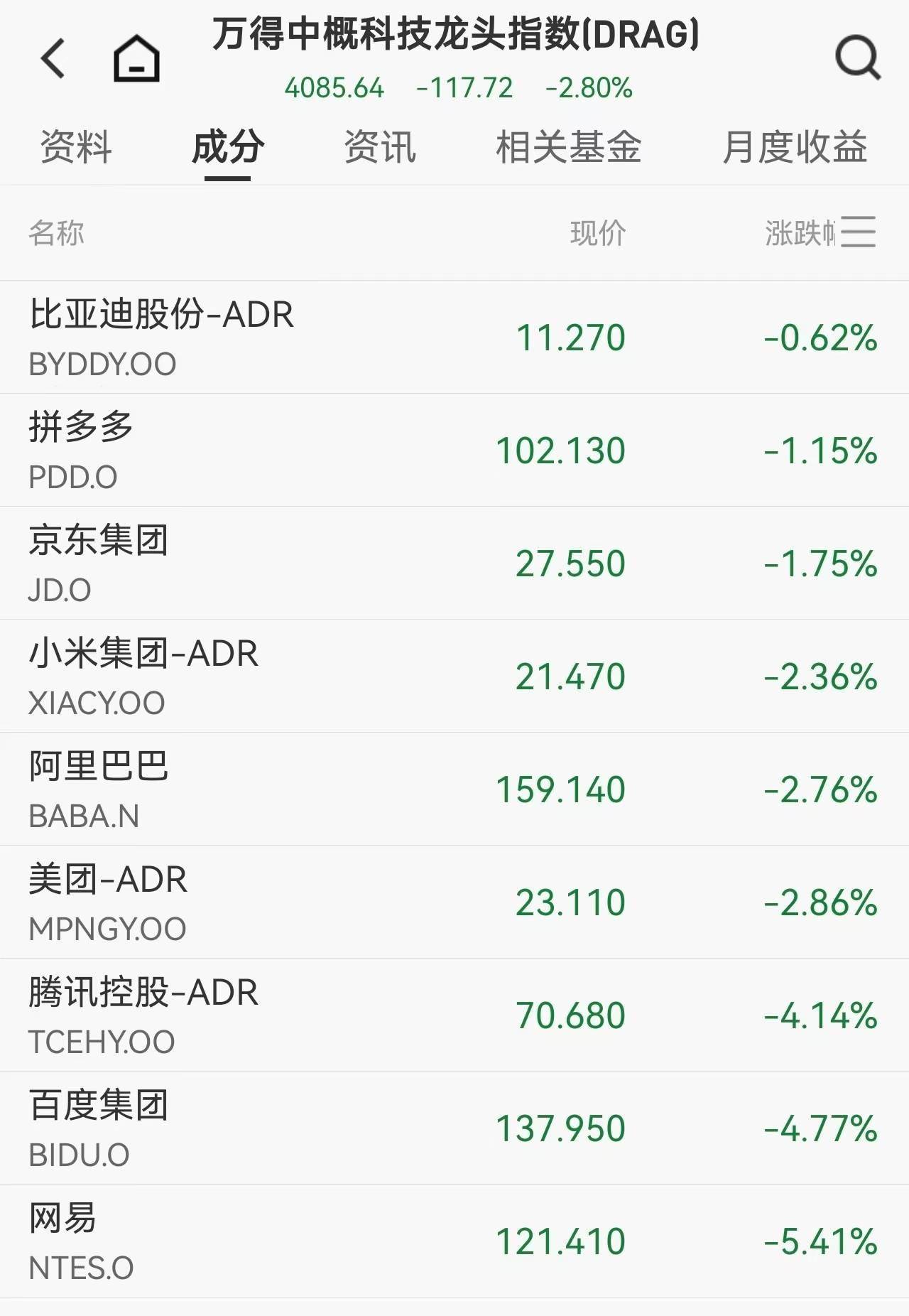 中概股市场呈现分化态势,纳斯达克中国金龙指数下跌1.95%,报7461.61点,多数热门个股走低,金山云、万国数据跌超7%,哔哩哔哩跌6.56%,网易跌5.41%,百度跌4.77%,阿里巴巴、蔚来、小鹏汽车跌超2%。但中概新能源与光伏股逆势爆发,亿鹏能源狂飙近58%,晶科能源涨8.66%,阿特斯太阳能涨逾3%,消息面上,马斯克团队近期密集走访中国多家光伏企业,引发板块集体拉升。