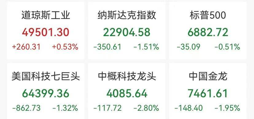 美东时间周三,美股市场呈现明显分化格局,道琼斯工业平均指数逆势飘红,而纳斯达克指数与标普500指数则受科技股抛售潮拖累收跌,与此同时,黄金、白银等贵金属及国际油价同步走强,市场资金在风险偏好调整中寻求避险与机会。