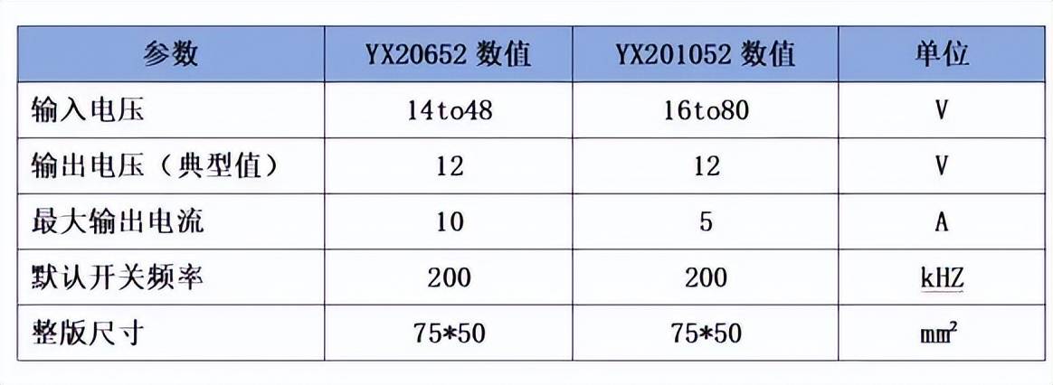 从参数上看,这两款demo均支持12V输出,默认开关频率为 200kHz,整板尺寸一致为 75×50mm。其中 YX20652 DEMO 覆盖 14–48V 输入、最高 10A 输出,更适合 24V/48V 母线的高电流降压场景;而 YX201052 DEMO 将输入范围拓展到 16–80V,最大输出 5A,更贴近 60V/72V 系统及更高输入耐压需求的应用验证。