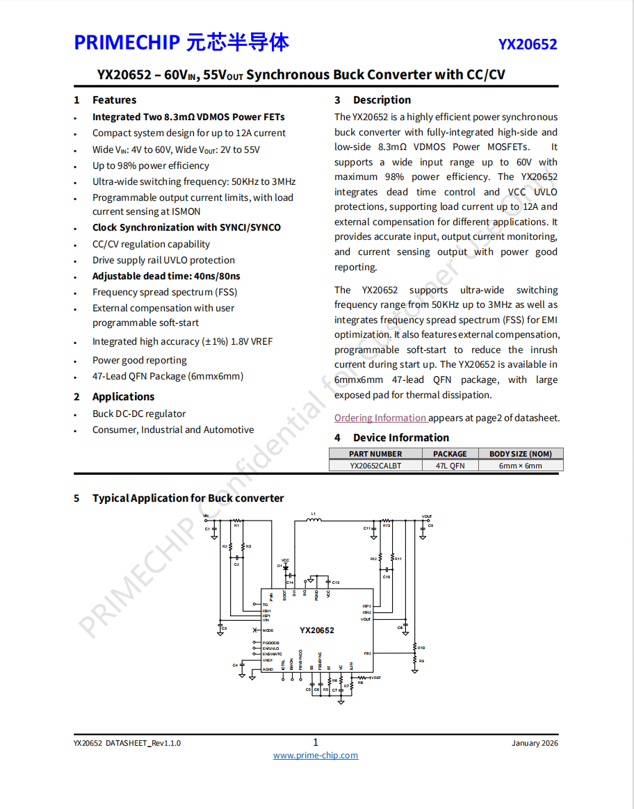 元芯半导体近期推出了全集成同步降压转换器YX20652/YX201052,面向48V/72V等高压供电系统。两款芯片将高低边功率MOSFET全部内置,应用中无需外置功率管,可显著减少外围器件与PCB面积,提升功率密度并降低方案实现成本。