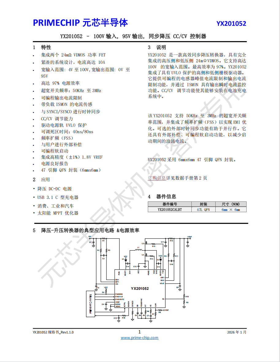 相比YX20652,YX201052 则将耐压能力进一步拉升到 100V 输入/95V 输出,支持最高5A输出,同样为同步降压转换器并支持 CC/CV 调节,芯片内部同样集成两颗 24mΩ VDMOS 功率 MOS管,更适合 72V 等更高电压平台以及需要更大浪涌余量的供电系统。