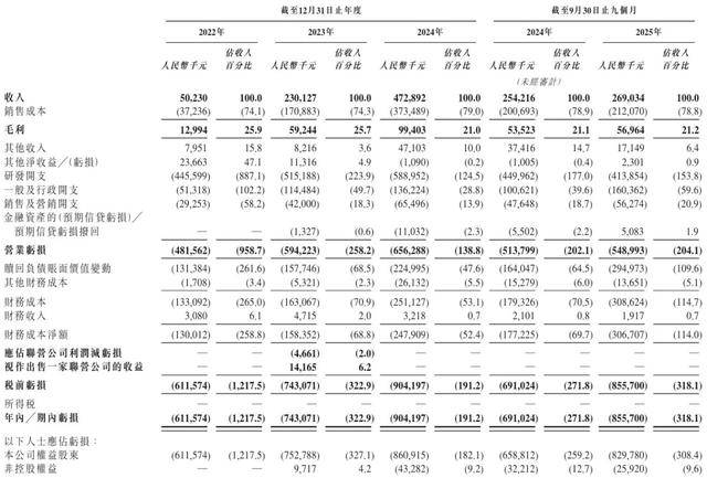 2022年、2023年、2024年以及2025年前三季度,公司的收入分别约为0.5亿元、2.3亿元、4.73亿元以及2.69亿元。同期,公司净利润分别约为-6.12亿元、-7.43亿元、-9.04亿元以及-8.56亿元。