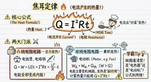 Joule's Law: The heat generated by an electric current passing through a conductor is directly proportional to the square of the current, directly proportional to the resistance of the conductor, and directly proportional to the time the current flows. Formula: Q=I²Rt