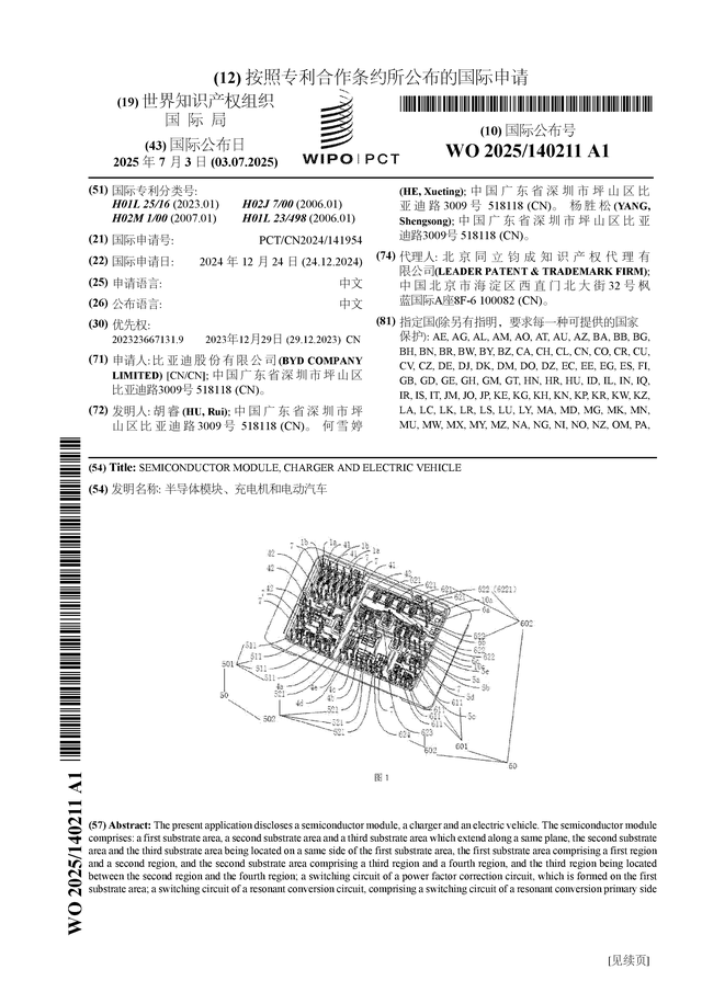 证券之星消息,根据企查查数据显示比亚迪(002594)公布了一项国际专利申请,专利名为“半导体模块、充电机和电动汽车”,专利申请号为PCT/CN2024/141954,国际公布日为2025年7月3日。
