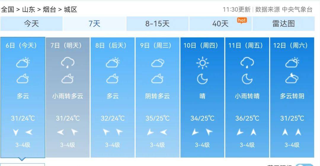 6日白天到夜间,鲁西北、鲁中和半岛地区天气多云间阴局部有雷雨或阵雨,其他地区天气晴转多云。鲁西北地区北风3~4级,其他地区北风转南风3~4级,雷雨地区雷雨时阵风7~9级。
