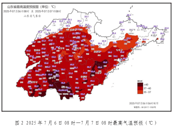 最高气温:鲁中、鲁南和半岛内陆地区37~39℃,局部可达40℃以上,沿海地区30~32℃,其他地区33~36℃。